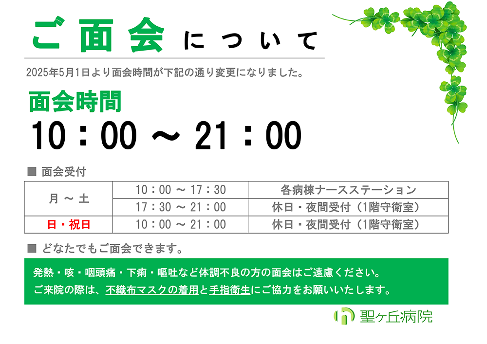 お知らせ 病院からのお知らせ 緩和ケアのお知らせ 人間ドック/健診のお知らせ 一般外来のお知らせ 採用情報 掲載年月一覧 年月から選ぶ 2026年1月 2025年12月 2025年10月 2025年9月 2025年8月 2025年4月 2024年8月 2023年6月 2022年12月 2022年4月 2025.04.30 緩和ケア 東京 多摩の聖ヶ丘病院|緩和ケア・人間ドック・内科 面会時間変更のお知らせ 前の記事へ 次の記事へ